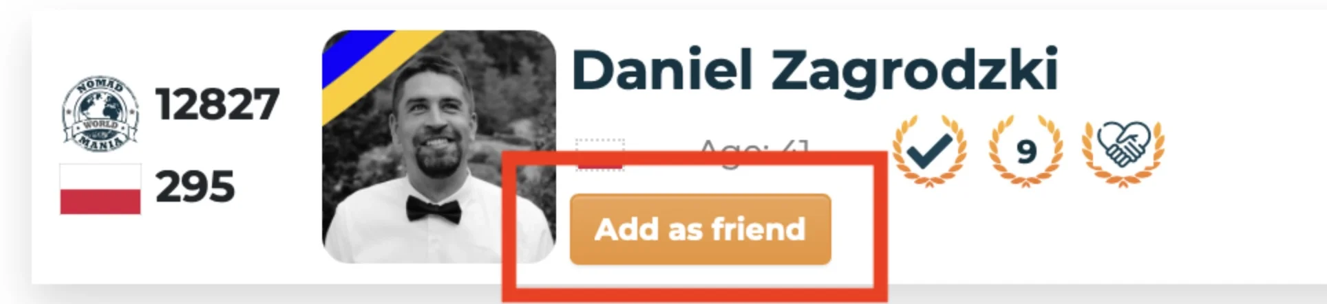 Simply visit someone’s NomadMania profile and look for the “Add as Friend” button. It’s right there, waiting for you to click and connect.