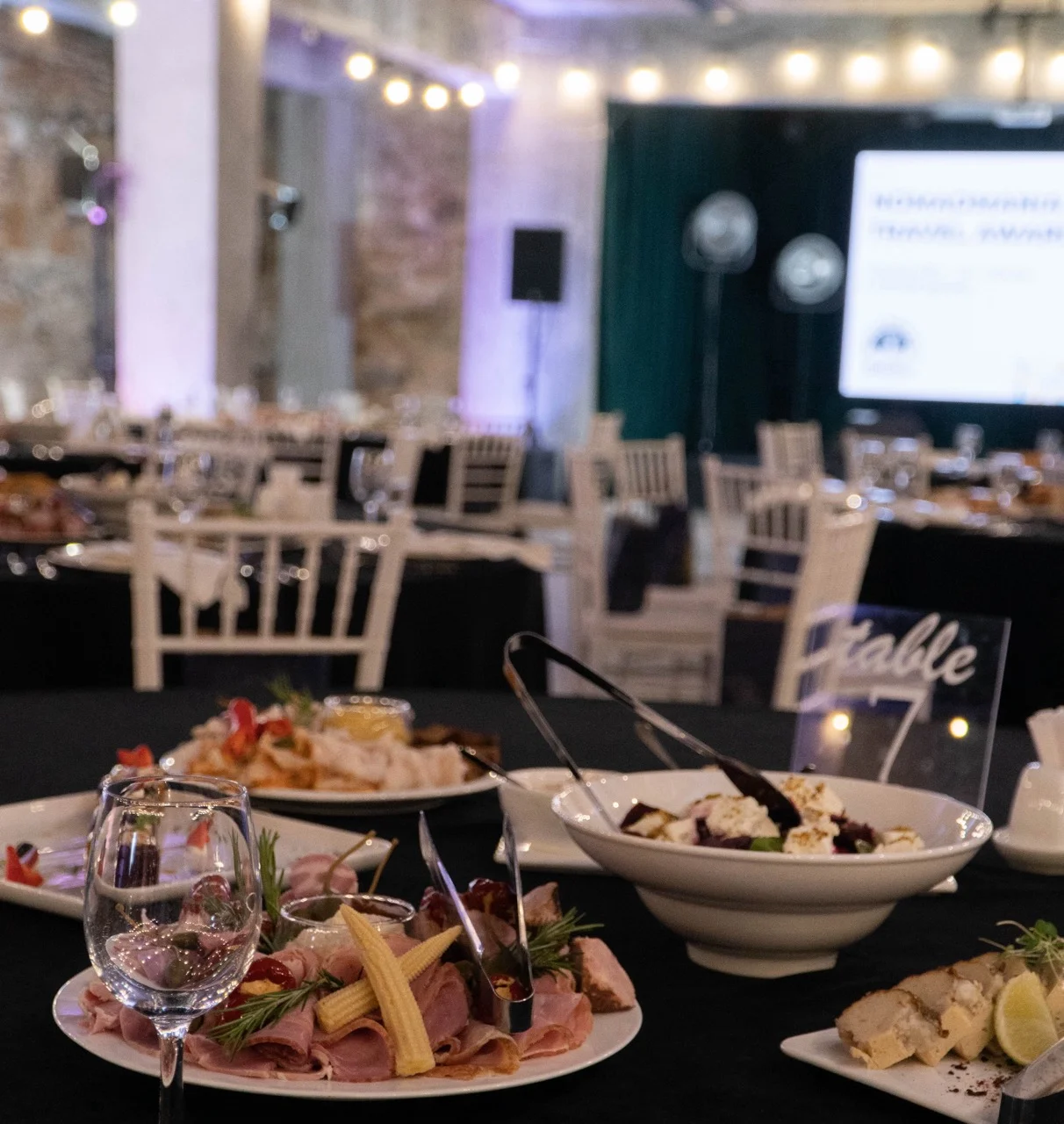 However, once the place was transformed with the elegant tables and the starters all laid out, and once the guests arrived, it no longer felt like a bunker at all. It was a real gala event with all the usual trappings, and ladies in impressive dresses were happy to pose with their drinks in from of huge NomadMania banners.