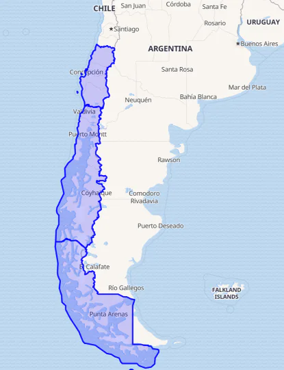 Two former regions South and Aisén & Magallanes are split in three: South Central, Chilean Patagonia, Magallanes. The new region is South Central.