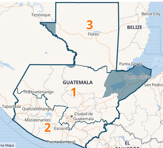 Changes in Guatemala reflect the country’s geography with Caribbean Coast becoming a new regions while some border adjustments between the Highlands and the Pacific Coast.
