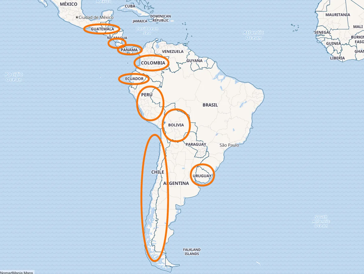 - Bolivia, Chile, Colombia, Costa Rica, Ecuador, Guatemala, Panama, Peru, Uruguay.