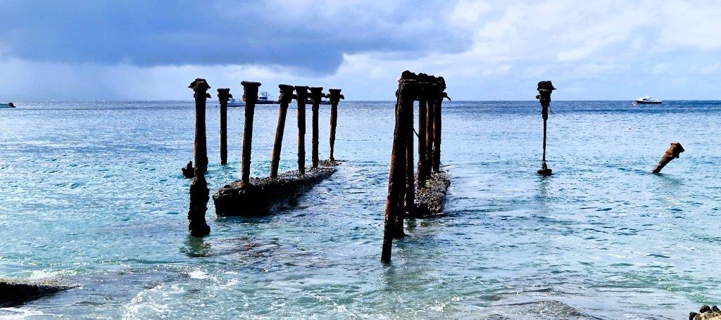 The reef runs parallel to the shore, some of it inextricably mixed with the colonial, underwater ruins. It’s maybe a couple of metres at its tallest and perhaps two metres below the surface. It’s not the most thrilling of underwater experiences, but there’s bright yellow coral, some crimson strands and plenty of small fish, parrot fish, sergeant majors, weavers, puffer fish. The usual suspects. They’re congregating in twos or threes though, or hiding under ledges. No shoals. There’s also a cannon or two.