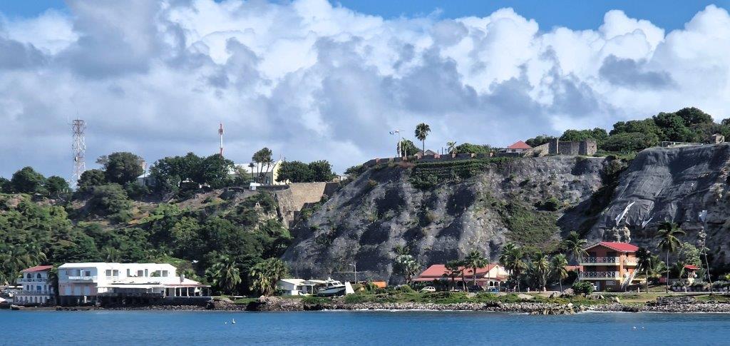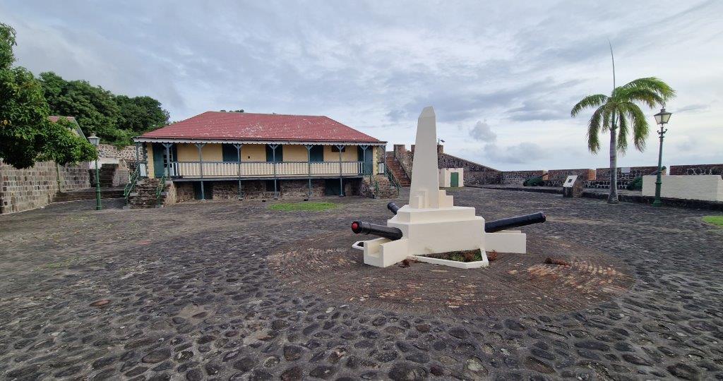 I think twice about entering Fort Oranje. This is the third fort in two weeks and I’m forted out. I’m going to change that phrase – it’s open to misinterpretation. I’m suitably fortified already. This seventeenth-century fort is as well built and maintained, as Brimstone, in nearby St Kitts, if smaller and lower down. It has cannons, intact bastions and a courtyard. The impressively steep slopes beneath have been reinforced and there are sweeping views along the coast. And some interesting history.
