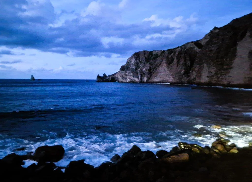 Cyril doesn’t turn up to collect me for the second half of my tour, until it’s almost dark. He’s still got his airport pick up in the car. We have words. He claims to be very sorry, as we scoot inside the Church of the Sacred Heart, at The Bottom. He’s even praying for forgiveness. I’m not sure God can help here. They’re big on Christmas lights on Saba, so there are illuminated houses to admire, at least. The beach at Wells Bay (famous Diamond Rock at the end of the point), on my list of Highlights To Tick Off, is just visible in the inky dusk.