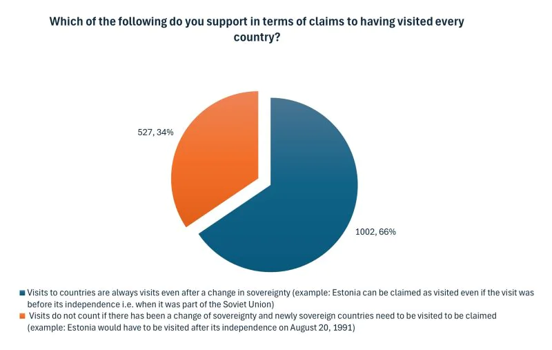 A majority of the respondents seem to value the historical context of their travels, recognizing visits made before changes in sovereignty as valid. This viewpoint appreciates the evolving nature of world geography and national borders over time. The substantial minority advocating for a more current and strict interpretation, emphasizes the importance of recognizing the present-day sovereignty and borders of nations in travel achievements.