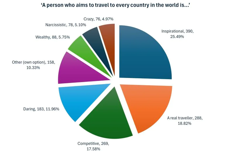 The ‘Other’ category, which garnered 158 votes, encompasses a wide array of opinions, with ‘Curious‘ leading in the majority of votes. Other notable mentions include ‘Driven‘, ‘Obsessed‘, ‘Ambitious‘, and ‘Determined‘, each reflecting a different aspect of the traveller’s personality and motivations. These varied responses underscore the complexity and individuality of the travel experience. They highlight that the pursuit of visiting every country is seen not only as a physical journey but also as a reflection of personal qualities and aspirations.