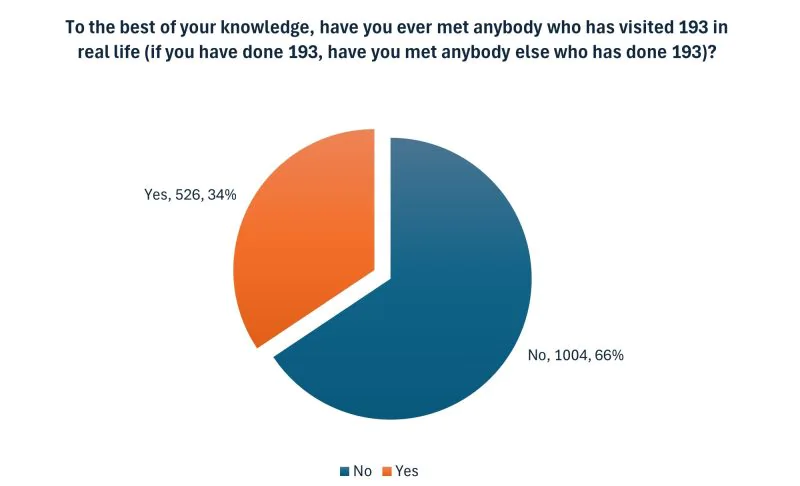 This question explored whether our community members have ever met someone who has visited all 193 countries. Out of the total 1,530 respondents, a significant majority of 1,004 (about 65.6%) indicated that they have not met anyone who has achieved this feat. This disparity underscores the uniqueness of completing such an extensive travel goal. It highlights that, even among a community of seasoned travellers, encountering someone who has visited every country is an exceptional experience.