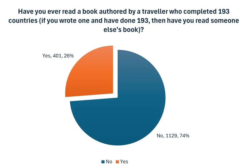 The second question probed whether our members had read a book authored by someone who had travelled to all 193 countries. Again, the majority, with 1,129 respondents, had not read such a book, while 401 affirmed they had. This result suggests that while the tales of such extensive travels might be compelling and inspiring, they are not widely circulated or read, even among a travel-savvy audience like NomadMania’s members.