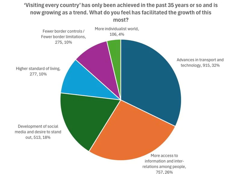 This question aimed to shed light on what factors are believed to have most contributed to the growing trend of visiting every country in the world, a feat achieved only in the past 35 years.