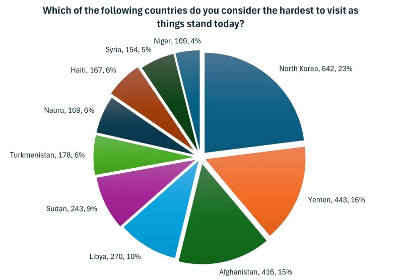 Topping the list is North Korea; selected by 642 respondents. This choice is unsurprising, given the country’s strict travel restrictions, political isolation and the fact that it has remained closed to travellers since the COVID-19 pandemic.