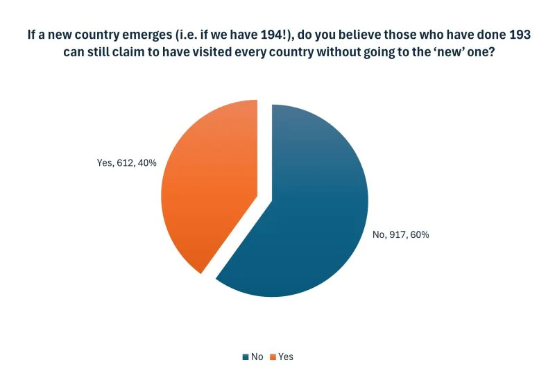 On the other hand, 612 participants (40%) voted ‘Yes’, indicating a belief that those who have reached the milestone of visiting 193 countries can still claim the achievement of having visited ‘every’ country, even if a new one emerges. This group seems to view the accomplishment in a more fixed context, based on the world map at the time of their achievement.