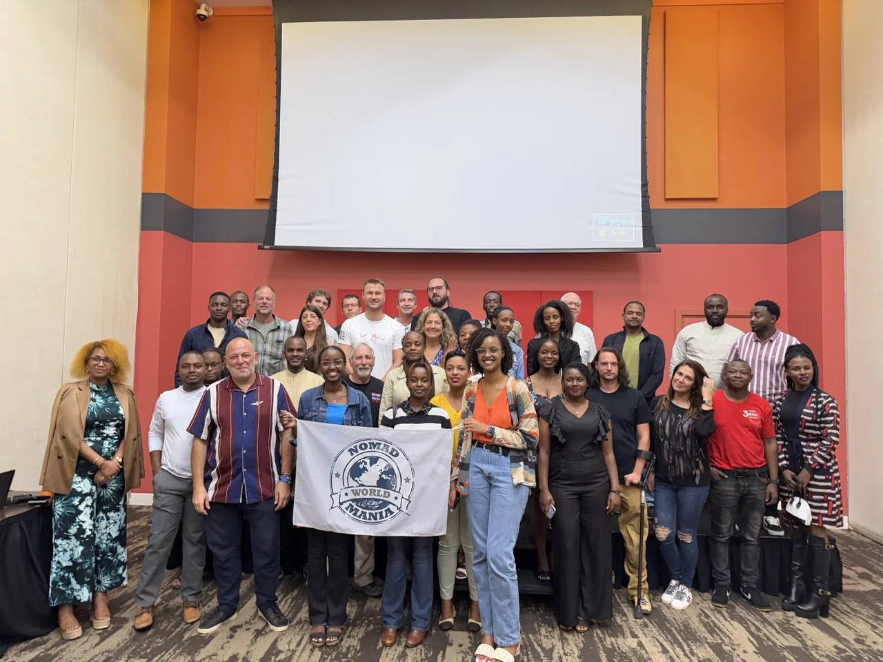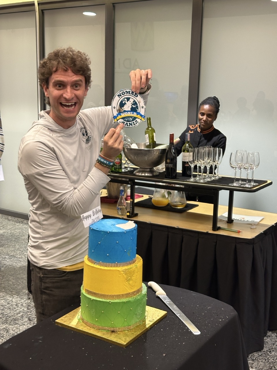 We ended the trip with a bang at the Kigali Convention Centre. Obed organized a meeting with local travel professionals and the press, and we presented NomadMania as well as our trip as a recap to it all. It also happened to be Jacopo’s birthday, so we got a cake in the colours of the Rwandan flag with the NomadMania logo.