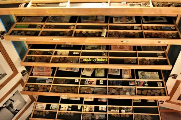 There is a bookshelf with all the guidebooks to prepare to go everywhere. There are cabinets with photos and when you open the doors, there are drawers with all the world currencies.