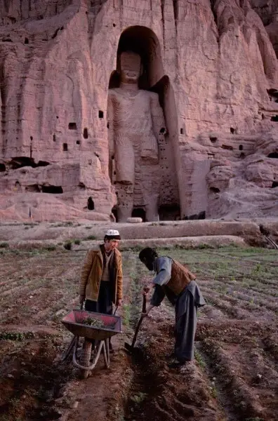 On to the Bamiyan Buddhas! By the time we reached the surprising green fields of the valley of Bamiyan, dusk was approaching the red cliffs with the giant standing Buddha statues. Their faces had been hacked off by iconoclastic Muslims centuries before, but the 180-foot height of the tallest one was stupendous as it dominated the small dusty village from its carved position in the cliff face.