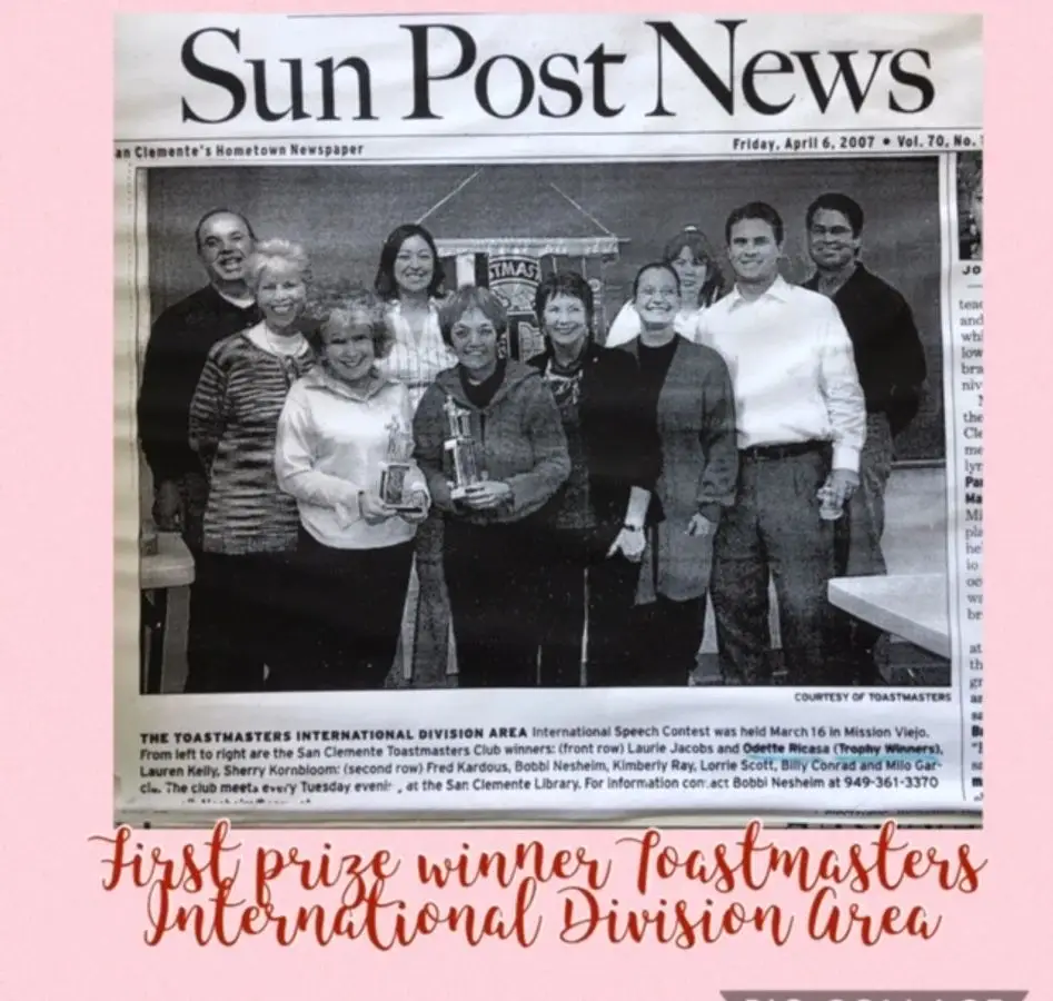 I have always wanted to improve my speaking skills. I joined the Toastmasters Club in San Clemente, CA. I attended weekly meetings for four years. There was a Division Contest in South Orange County, El Toro, Mission Viejo, San Juan Capistrano and San Clemente. I practised my speech day and night making sure to end in 9 -1/2 minutes, right before the red light showed.