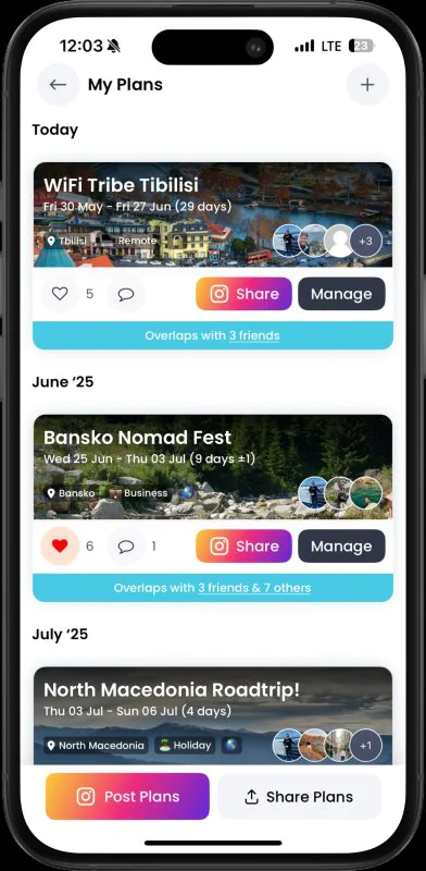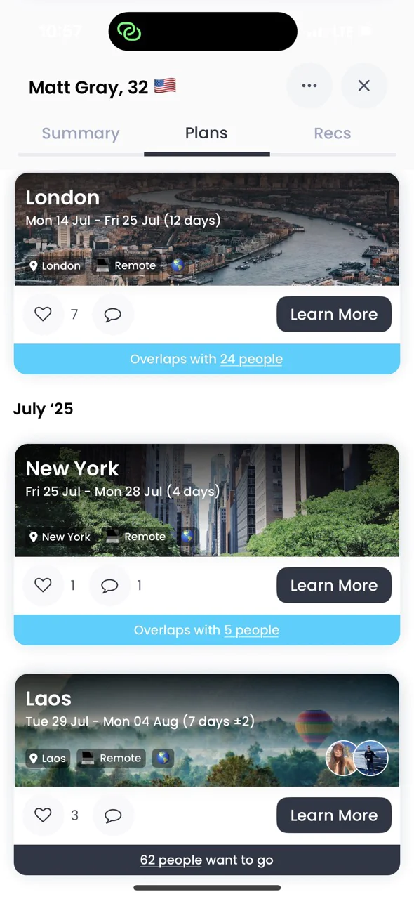 You simply add your upcoming travel plans – both confirmed trips (i.e. London from July 13-25th) or tentative plans (i.e. I want to spend 4 days in Laos in August or September) into the app, and decide who else can see these plans. You can make them public if you want to meet other travelers on the app, or keep them private so only your friends can see them. When you add a new trip or start your journey, your friends are notified. This allows everyone to comment, share recommendations, decide to join you, or introduce you to their local contacts in a city.
