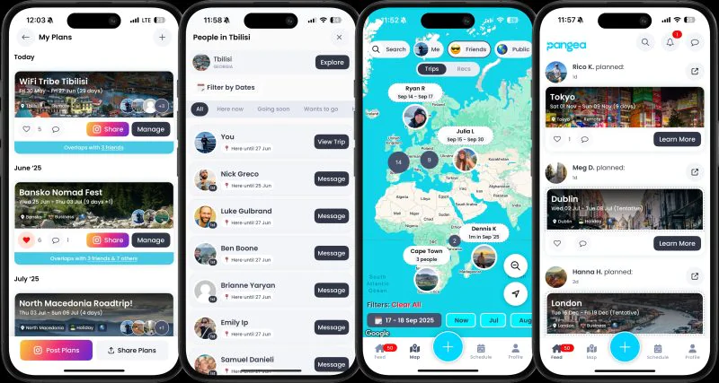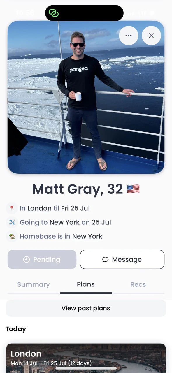 Pangea is designed to enable serendipity. It’s a free & simple way to share your plans with friends, see who else is traveling (or wants to travel) to the same places as you, and get notified when your plans overlap. We want to make it easier for people to coordinate their plans, and see their friends more IRL, wherever that might be.
