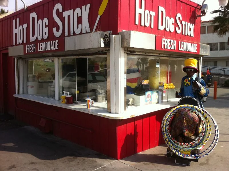 The “Hula Hoop Guy” takes a break at “Hot Dog Stick” at the Santa Monica Pier