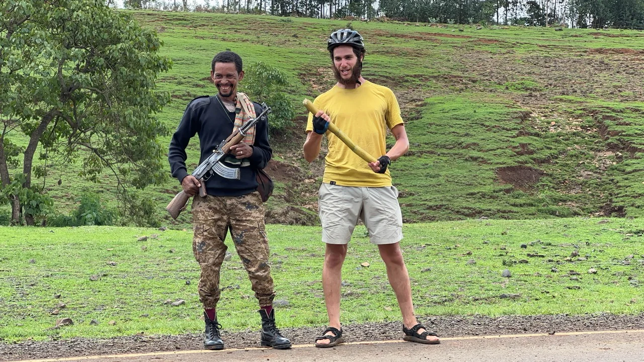 To complicate things further, shortly after our arrival, the central government cut off the internet in the Amhara region. Civil unrest erupted soon after, with military trucks rolling in and civilians firing guns into the air. The government had just announced plans to disarm the Amhara region, centralizing weapons under military control. Flo and I decided it was safest to camp near the police station that night, amidst the sound of gunfire and a nine-hour church mass broadcasted through village loudspeakers.