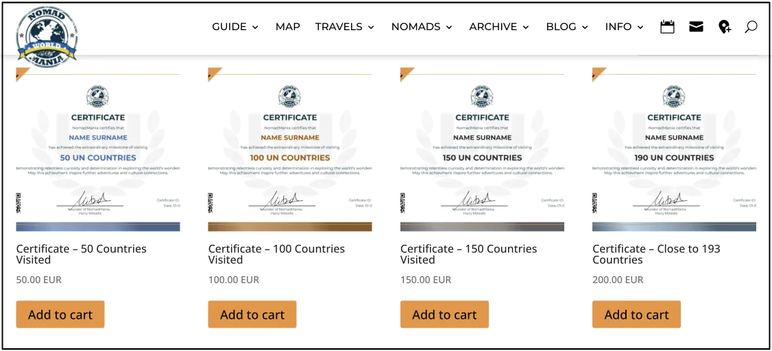 It is an original unique numbered printed certificate issued by NomadMania confirming you’ve visited a certain amount of UN countries. At a size of A4 (210×297 mm / 8.3 x 11.7 in), it is available to purchase for everyone who is a NomadMania member and has reached a certain number of visited countries.