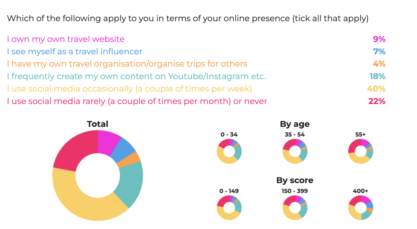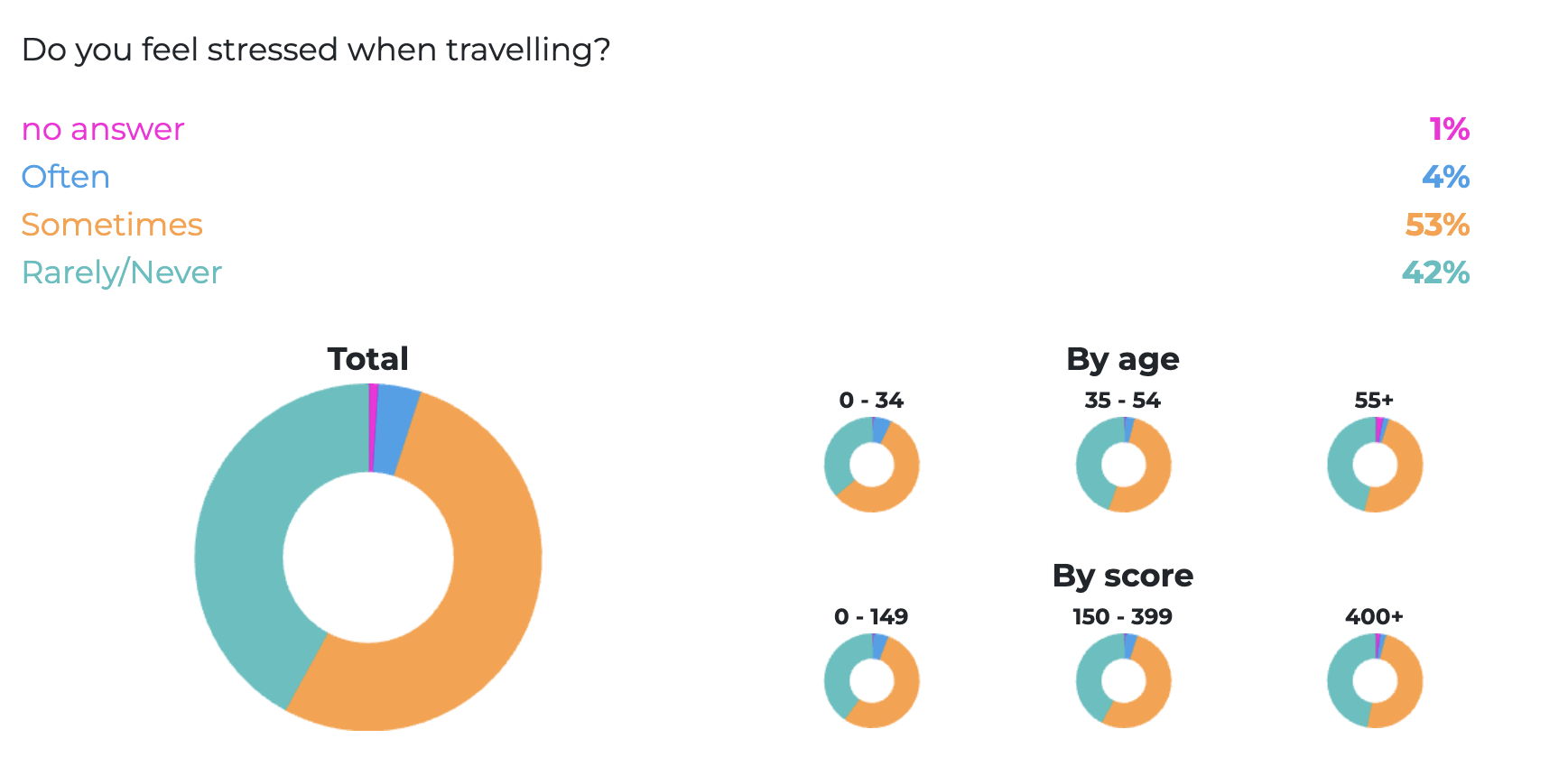 Our question on loneliness also yielded interesting findings. 64% of our community felt that travel rarely or never makes them lonely. That said, there was key differential between our younger travelers (0-34) and older travelers (55+). 37% of our younger travelers felt that they are sometimes lonely, compared to only 17% of our older travelers.