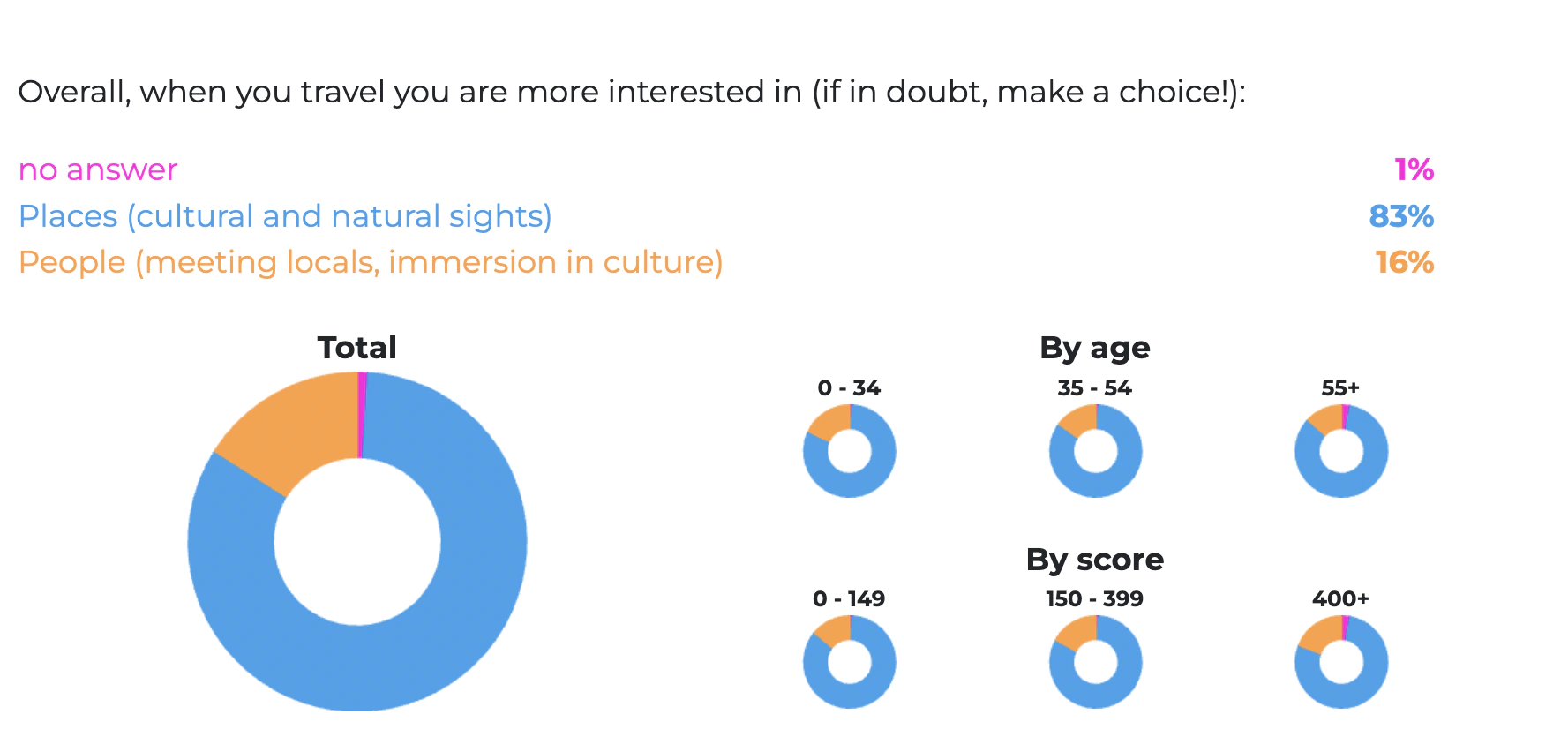 When traveling, 83% of our community members are more interested in places, such as cultural and natural sights, while 16% focus on interacting with people and immersing in local cultures. This preference underscores the diverse interests of travelers, seeking either the beauty of destinations or the richness of human connections.