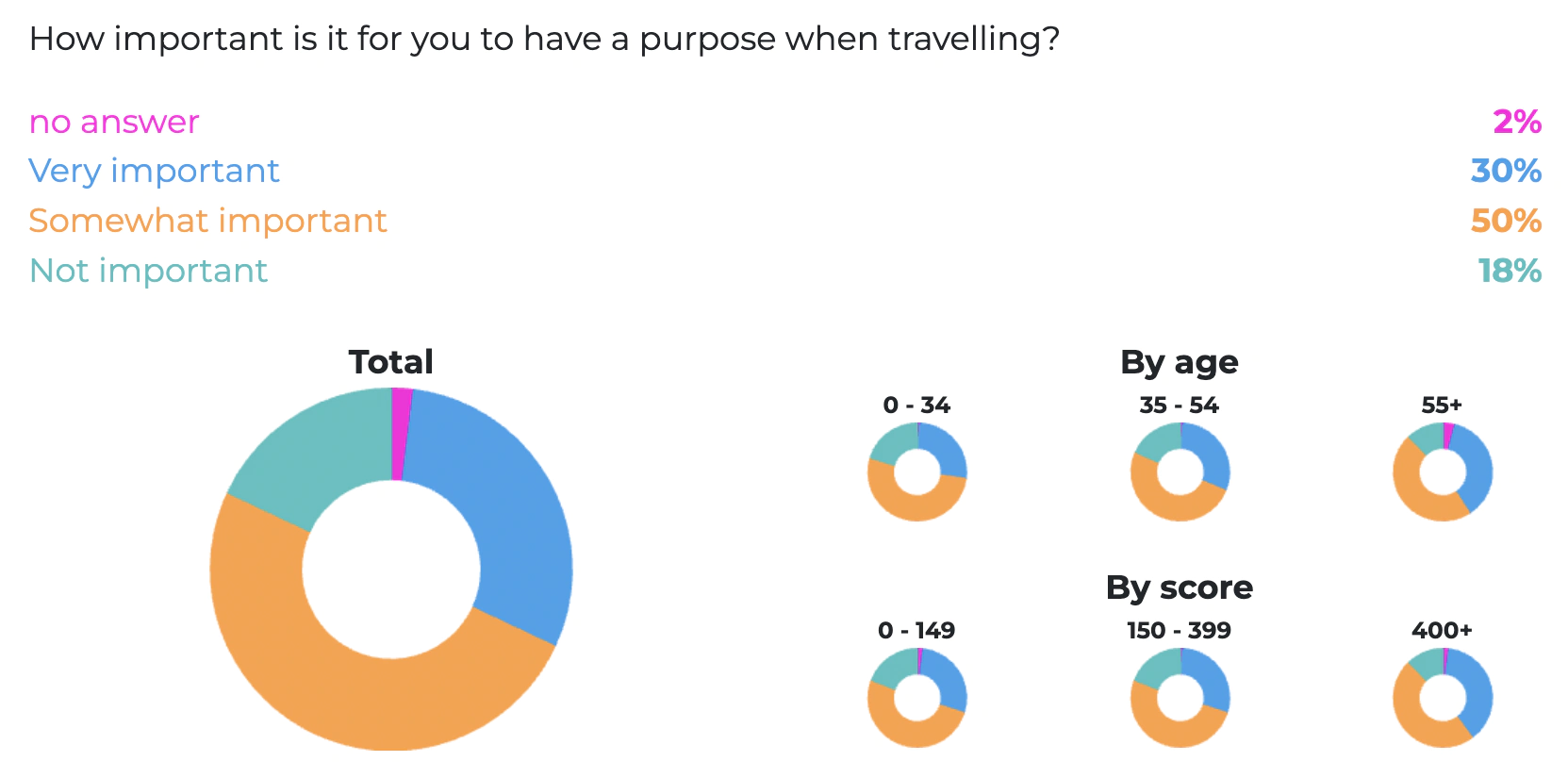 When asked about the importance of having a purpose while traveling, 80% of our community answered that is was either very important or somewhat important to them. We suspect that this overwhelming percentage is distinctive to our community, as opposed to the to the average traveler.