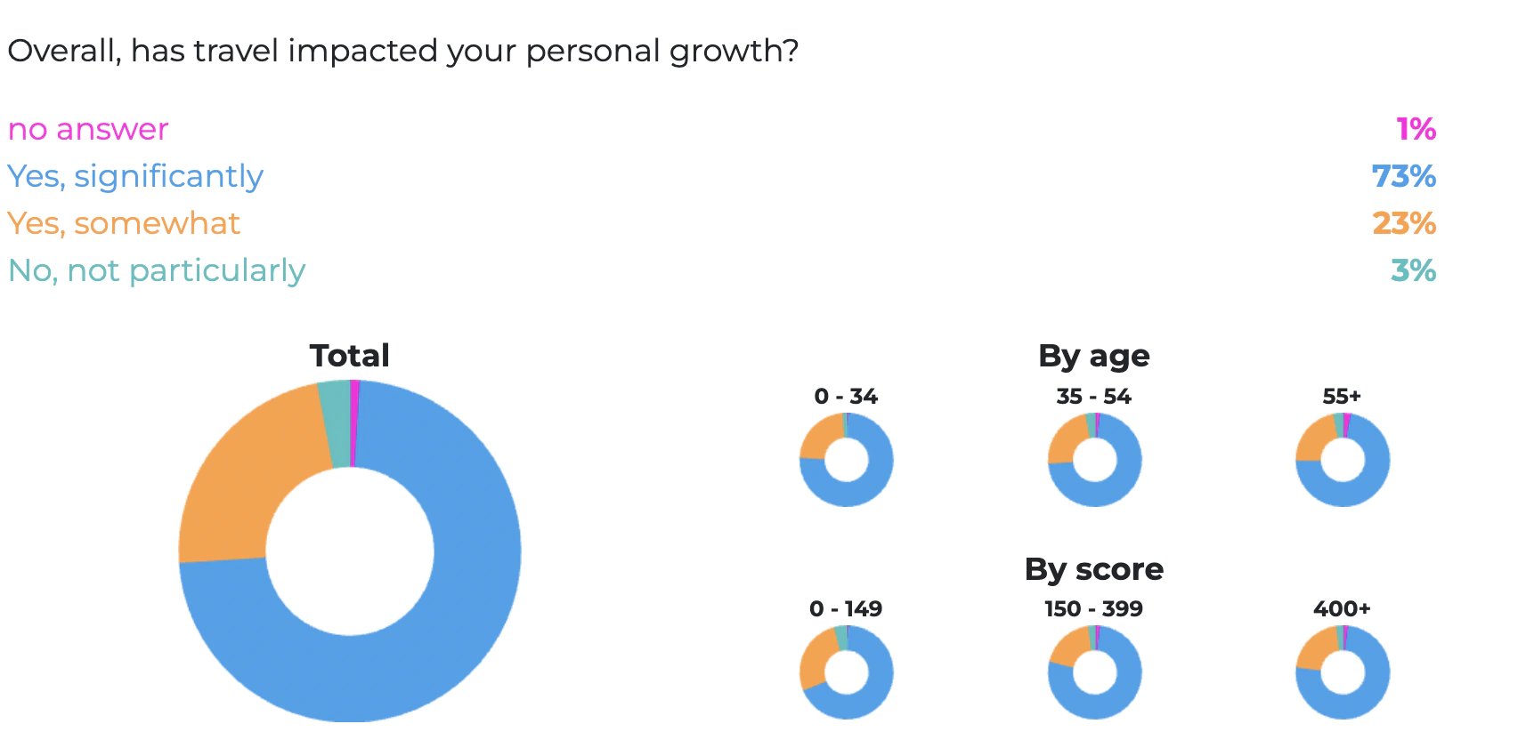 Unsurprisingly, our question on personal growth yielded similar results. 96% of our community responded that travel has either impacted their personal growth significantly (73%) or somewhat (23%). Perhaps this is the single biggest differentiator between our community and the average traveler.