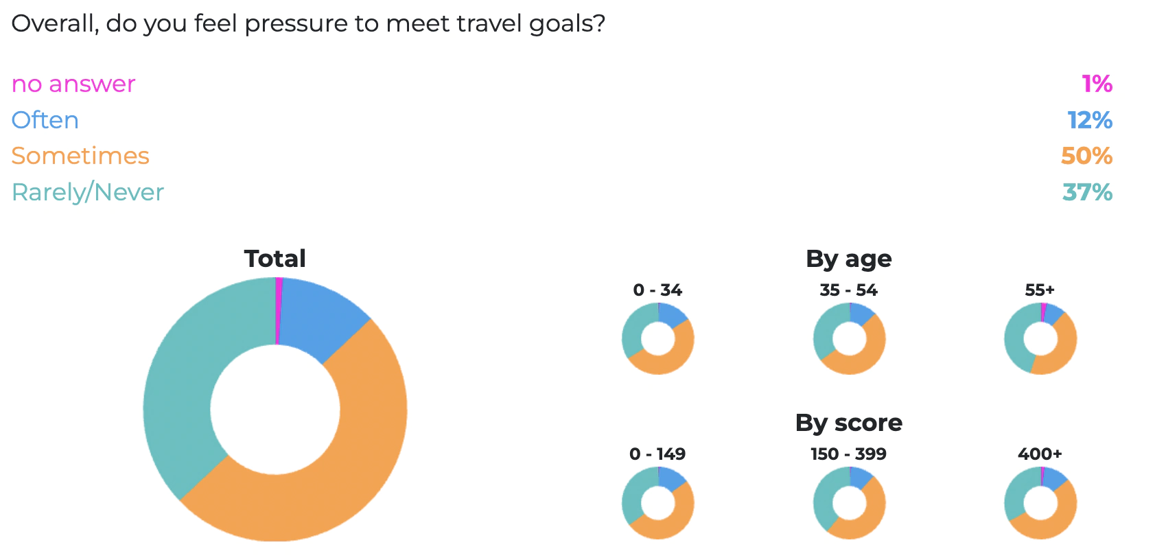 With our community being known for ambitious travelers, 62% did admit to feeling pressure to meet travel goals. On the contrary, 37% responded “rarely or never” feeling pressure to do so.