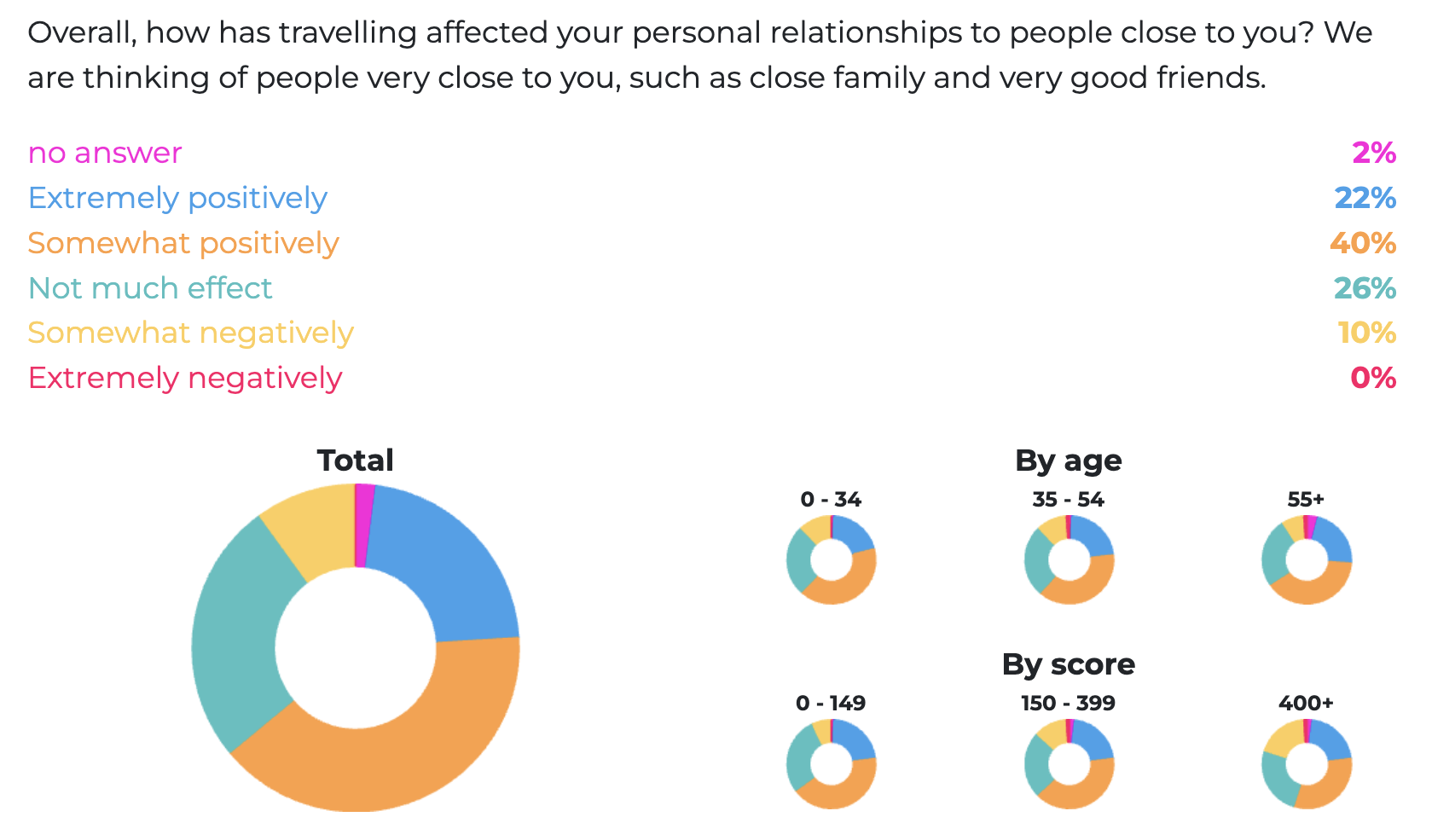 One interesting finding pertains to the impact of travel on relationships. 62% of respondents said travel has a “somewhat to extremely positive” impact on their relationships with close friends and family, with only 10% seeing a somewhat negative effect; 26% stated travel did “not have much effect” on their relationships.