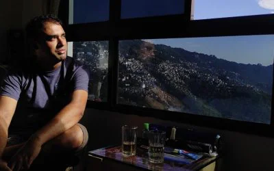 A picture of Benny Prasad, the first person from a Low Passport Idex Country, who visited every country in the world, holding a trophy, all his passports and a guitar