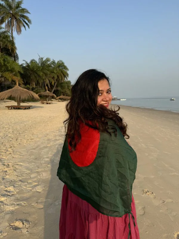 A picture of traveller Maliha Fairooz on the beach wrappen in a Bangladeshi flag