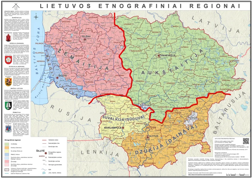 Lithuania is divided into 5 historical / ethnographic regions – Aukštaitija, Žemaitija (Samogitia), Lithuania Minor (Mažoji Lietuva), Dzūkija and Sudovia (Suvalkija). This is based on dialects and other traditions and these divisions are well known with many Lithuanians identifying with their region.