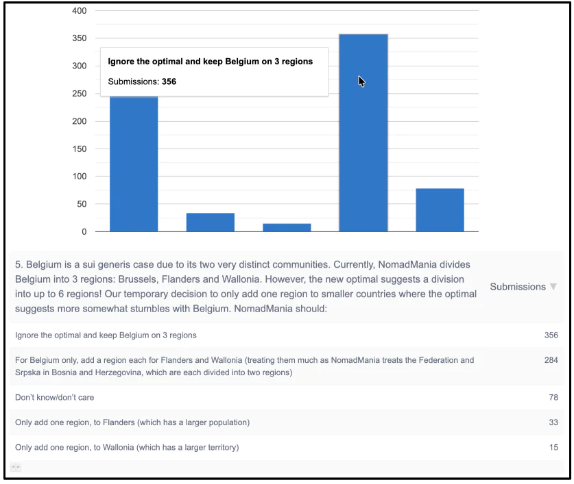 Surprisingly for us, the proposed addition of regions to Belgium were also rejected by the majority, though this vote was closer. Specifically, 46% reject any new regions for Belgium with 37% supporting the addition of 2 new regions. A total of 6% more supported adding one region, either to Flanders or to Wallonia. However, it is clear we do not have a mandate to split Flanders and Wallonia and therefore we will not.