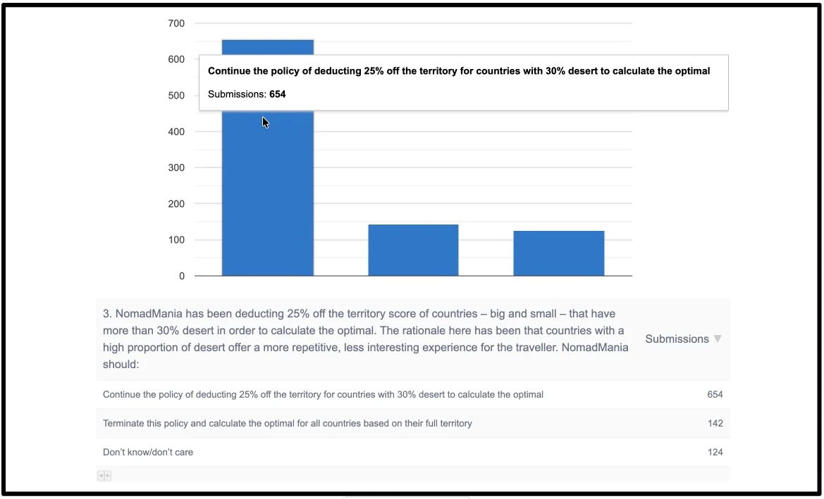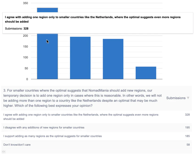 This pattern repeats itself if we look at the data based on how many regions respondents have been to. For travellers with less than 150 NomadMania regions, 46% want us to follow the case-by-case option, 31% want us to follow the optimal closely while only 15% reject the optimal.
