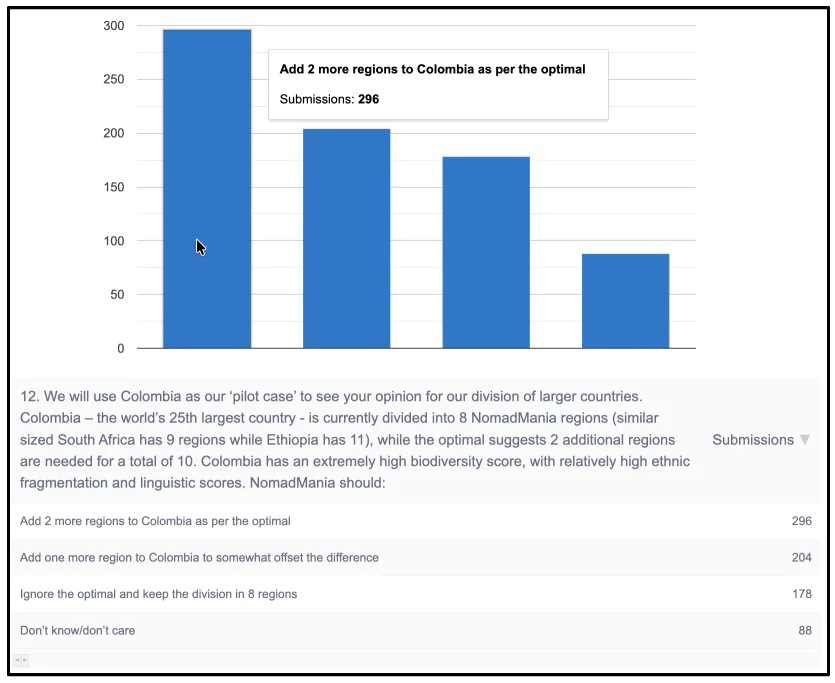 For Colombia, the vote has come back in favour of adding the 2 regions suggested, to approach the optimal (39%), compared to those supporting only one region added (27%) and those against any additions (23%).