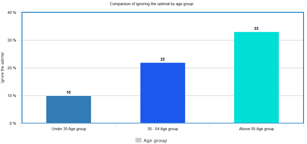 Once again in these last results, we see a similar trend by age and number of regions. 33% of older travellers want us to ignore the optimal compared to only 10% of the younger ones under 35 (the 35-54 group is in the middle, with 22% rejecting the optimal).