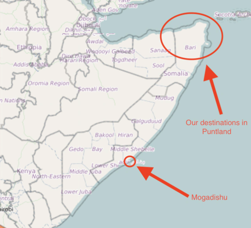 The real adventure starts for us in Puntland, so it’s certainly good news that we have tanked up on the cafes and modernity of Mogadishu. Puntland is a semi-autonomous state that spans the northeastern part of Somalia and in the north borders Somaliland. It is a breakaway state that claims total independence (albeit unrecognized). Puntland is part of Somalia but has considerable autonomy and its own flag.
