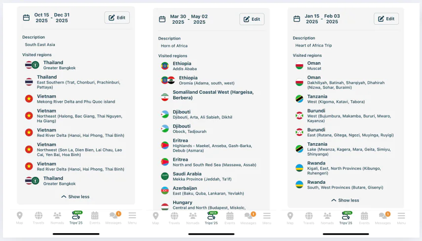 This transition is also a necessary step towards the upcoming Trip Matching Tool. Imagine two members adding future trips that overlap by region and dates — our system will notify both, allowing you to connect, plan together, or simply meet along the way.