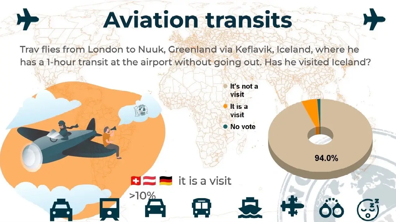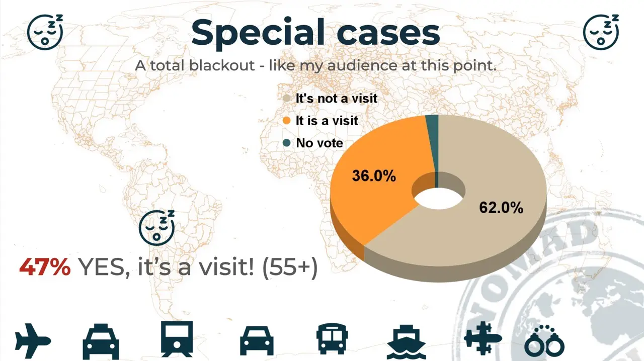 Our poll indicates that the threshold is experiencing something significant. 59% reject the transit when this only involves a quick stop at a gas station even if Ling went out of the car to buy a bottle of water; however in the example where Ling did not get out of the car but drove around Skopje and saw the town, 62% did consider this a visit. Implication: putting your foot on the ground is not enough on its own, but it isn’t even necessary if you see something of the country. It goes without saying that just ‘crossing the line’ into a country/region is totally rejected as a consequence of this vote.