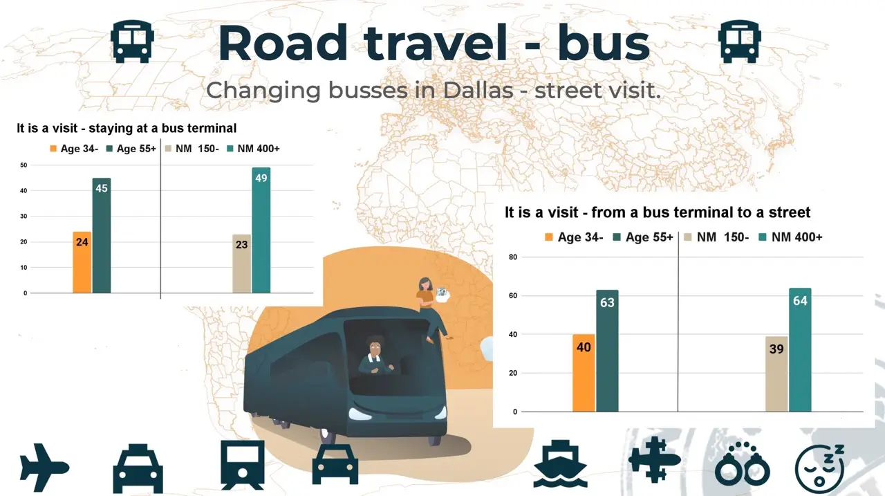 Road travel, at least in the case of a bus, painted a similar picture as the previous two. It appears that our community is not so keen to accept any kind of visit that only includes stations/airports. The breaking point seems to be getting out of such places and seeing at least a bit – even if it’s just the Jackson street in Dallas or a roundabout in Addis Abbaba.