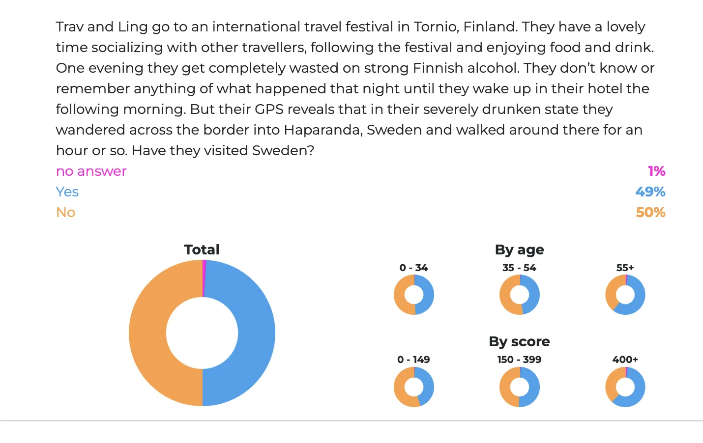 Another really close vote, whose result actually surprised us with its closeness, is the extreme example where Trav and Ling do not even remember their experience in a country because they were drunk.  The aim of this question was to see the perceived significance of consciousness during a visit. This is also a 49-50% result, with the ‘no’ winning by the skin of its teeth.