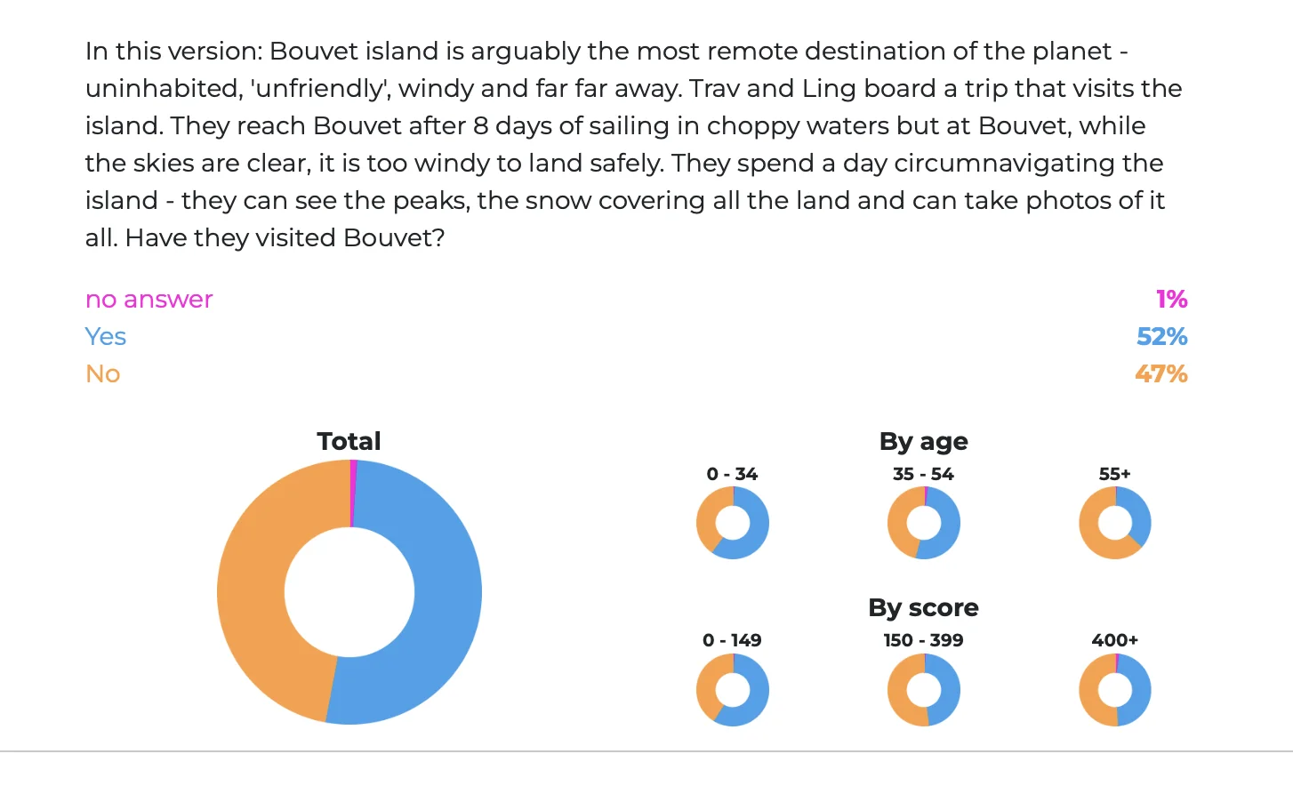 Our poll then took a different direction by asking extremely specific questions in certain examples. An interesting one is at Bouvet Island. One scenario had our heroes land on a remote Antarctic island in a total fog, where they couldn’t see a thing. The other example had our heroes fail to land but they circumnavigate the island and see quite a lot of it. Interestingly here, in both cases the majority consider this a visit but the percentages are very different: when they land without seeing anything, this is 82%. When they don’t land but see a lot from afar, it is only 52%.