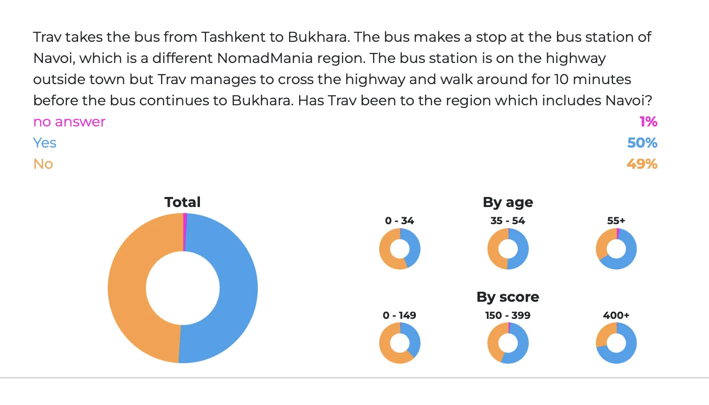 In fact, the closest vote is shown below with a 50-49% split and 1% abstaining. In the example where Trav goes outside the bus station at Navoi, Uzbekistan for 10 minutes only, 50% accept the visit, with this percentage being higher for older and more experienced travellers; and much lower for younger and less experienced ones.