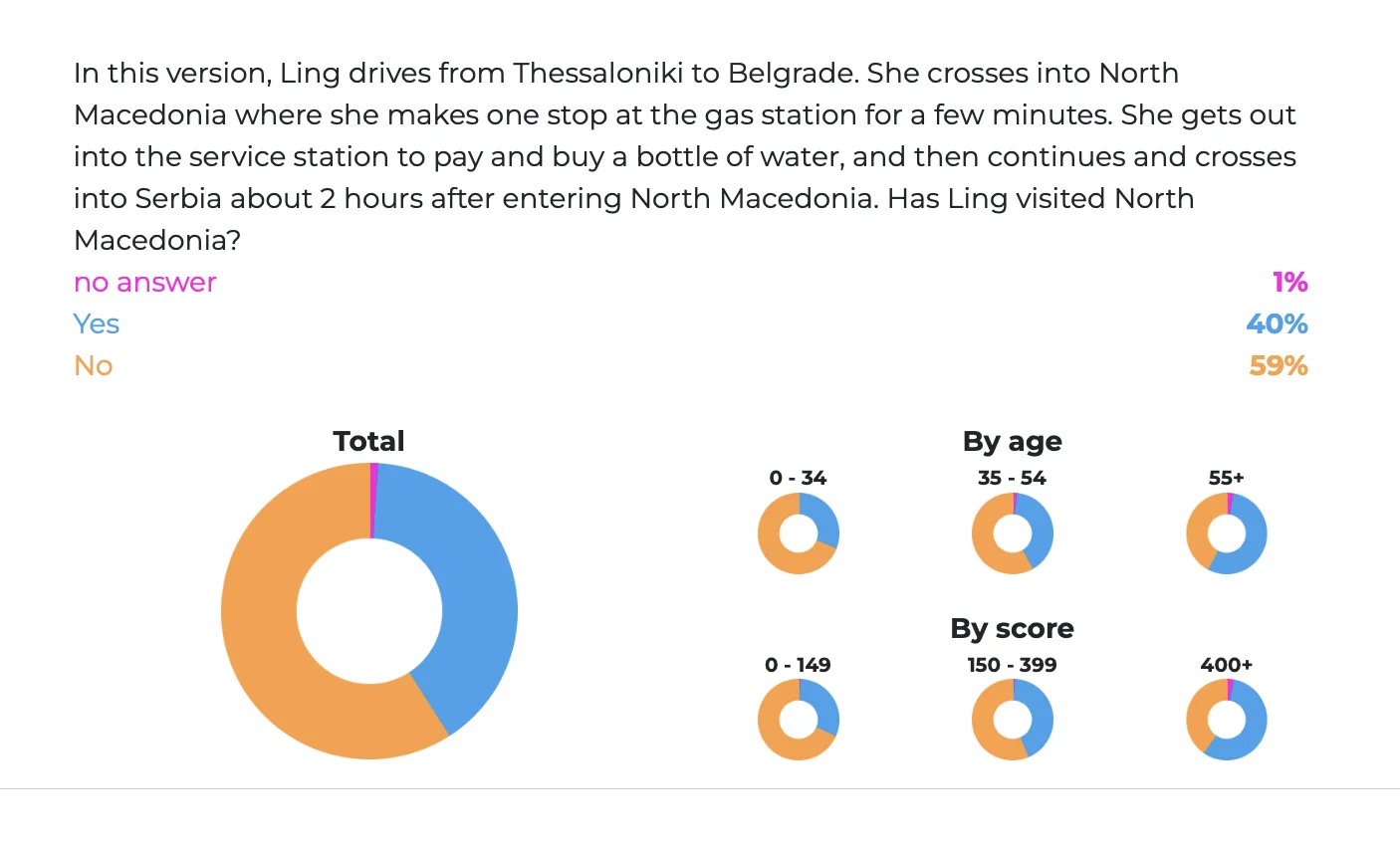 We asked most aviation questions in our first poll, so this second one focused on other issues, including transit by land, with four questions presenting different versions of our mascot Ling’s transit from Greece to Serbia via North Macedonia.