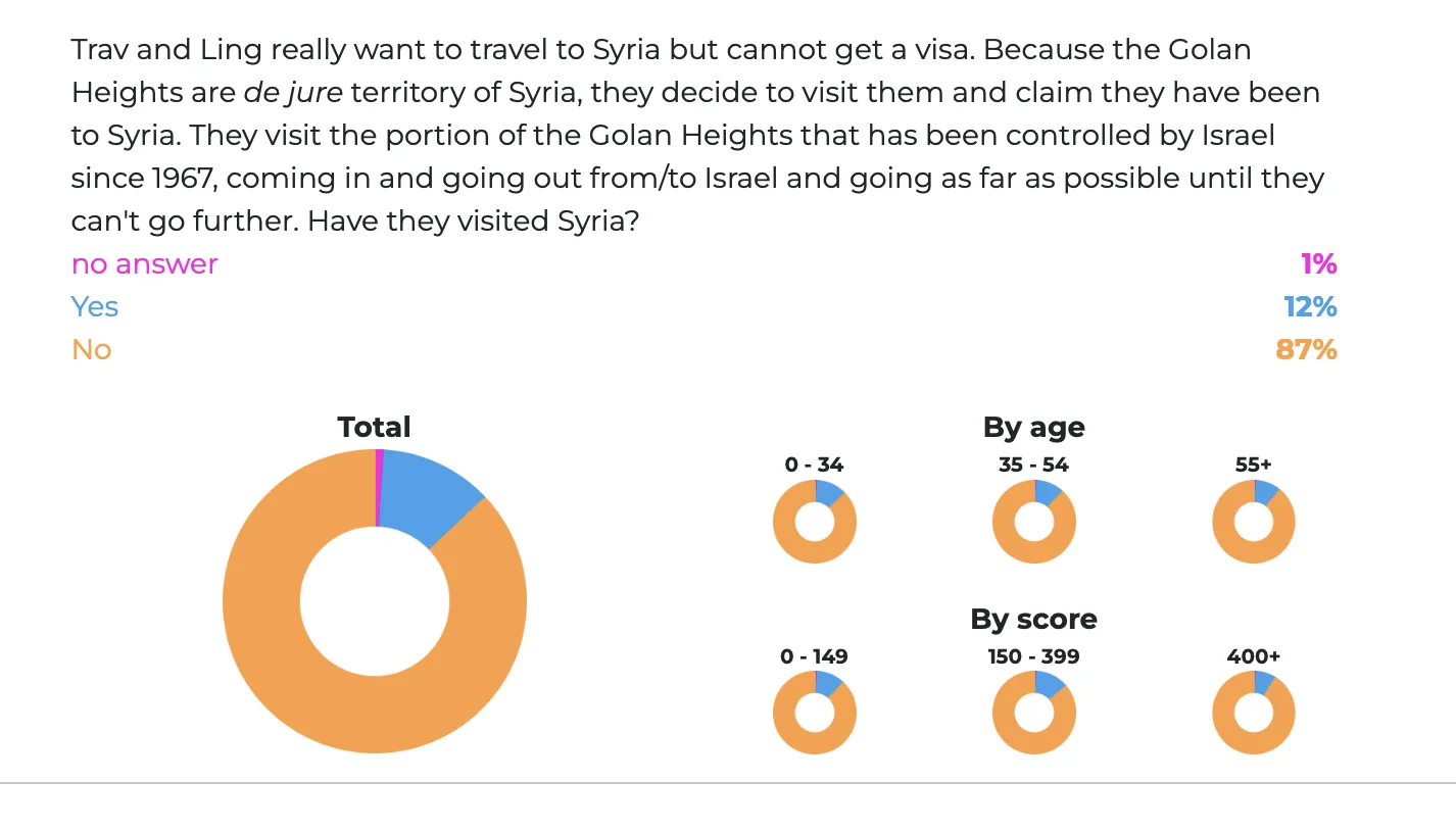 In the example of an exclave, Karki, which is de facto no longer part of the country even if it is de jure, 38% consider this a visit Azerbaijan and 61% reject this. What is interesting here is that even though technically Golan Heights would be the same example (an area which is de jure part of one nation but de facto belongs to another), only 12% accept this as a visit to Syria compared to a massive 87% rejecting this. Similarly, for the DMZ visit between the two Koreas, only 17% accept this as a visit to North Korea compared to 82% firmly rejecting it.