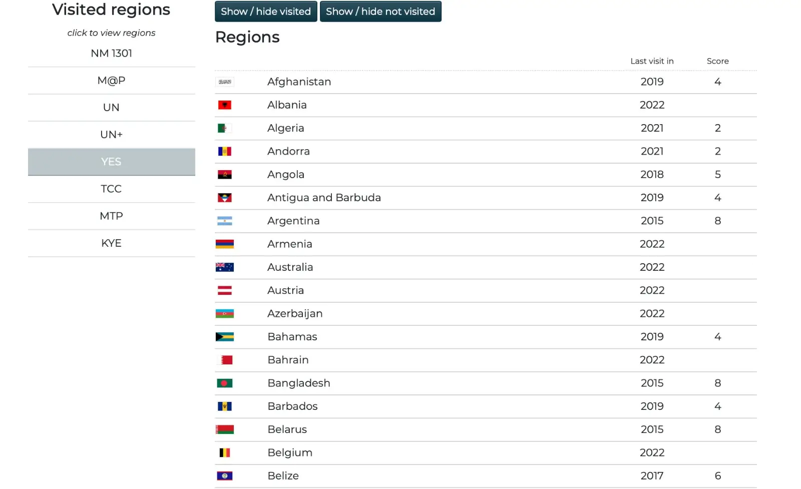 The list considers countries only, not regions, and we take 196 countries (193 and Palestine, Taiwan and Kosovo). If you have completed your year of visit to a country (which is better done through My Trips, where you create a specific trip with dates), your YES will be automatically calculated. Here is how it works.